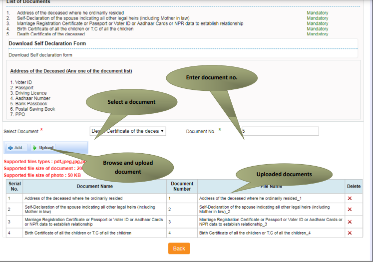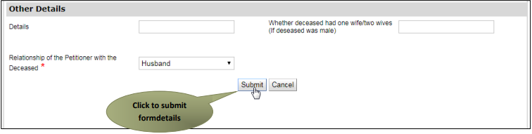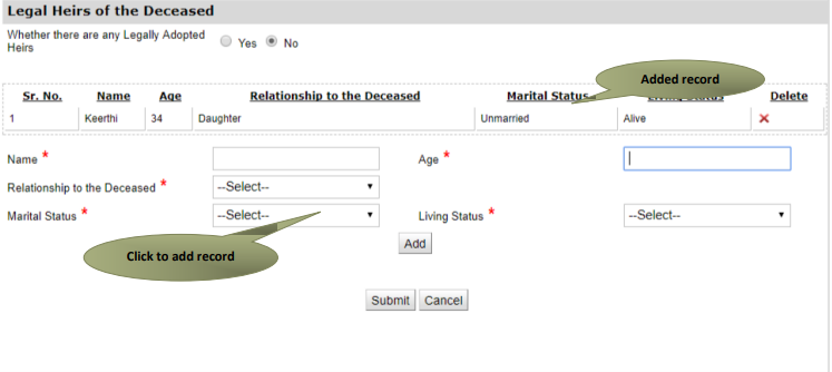 Provide details for the nominees/legal heirs of the deceased. Enter the information using the available fields and click on the ‘Add’ button to add a record. The added records will be shown at the top.