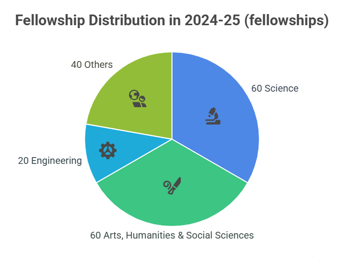 - In 2024–25: 180 fellowships divided as follows: (60 in Science, 60 in Arts, Humanities & Social Sciences, 20 in Engineering, 40 in Agriculture, Education, Oceanography, Veterinary, etc.)